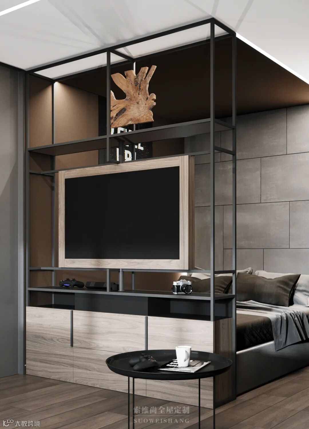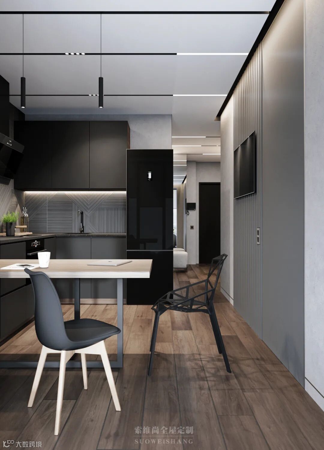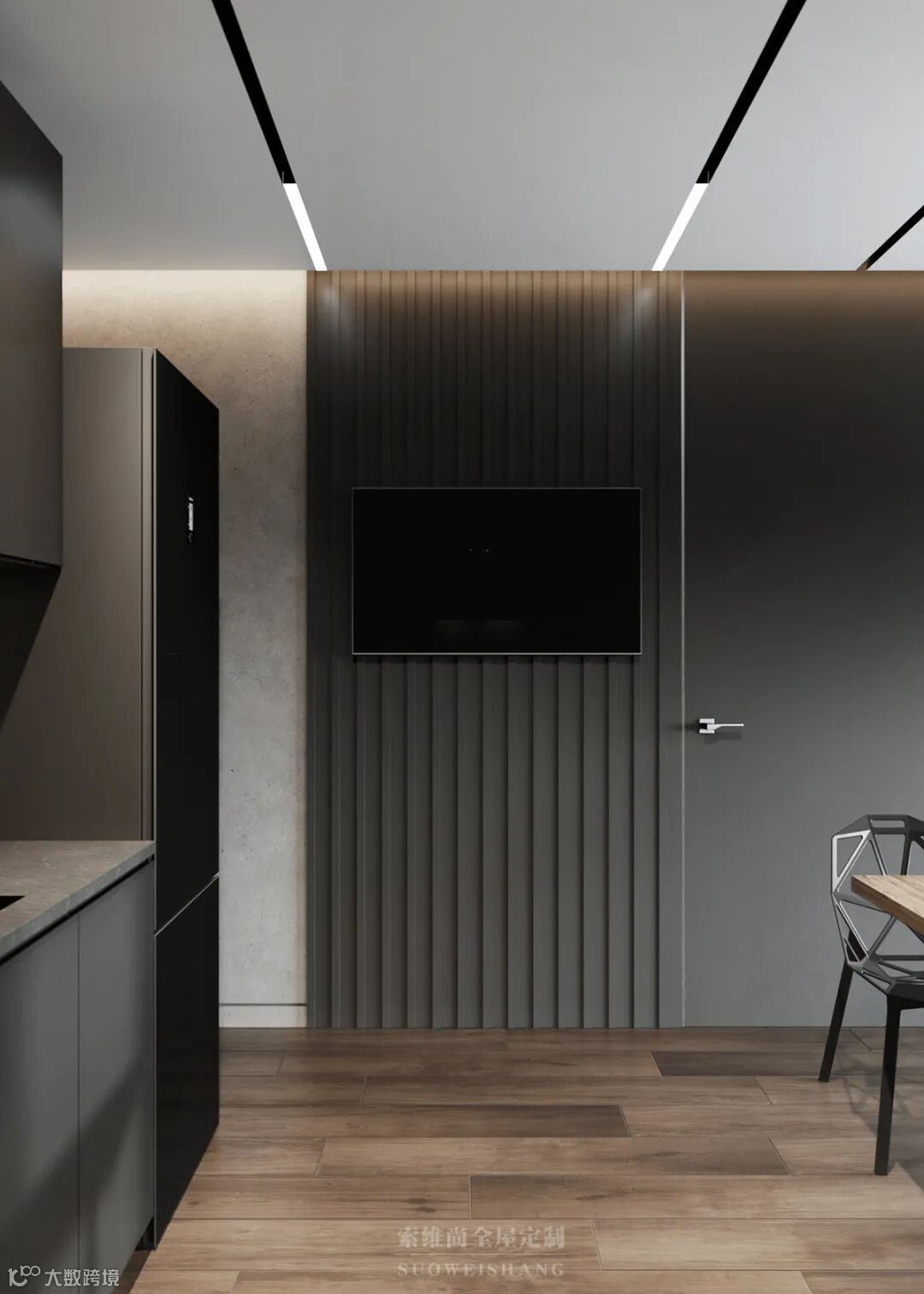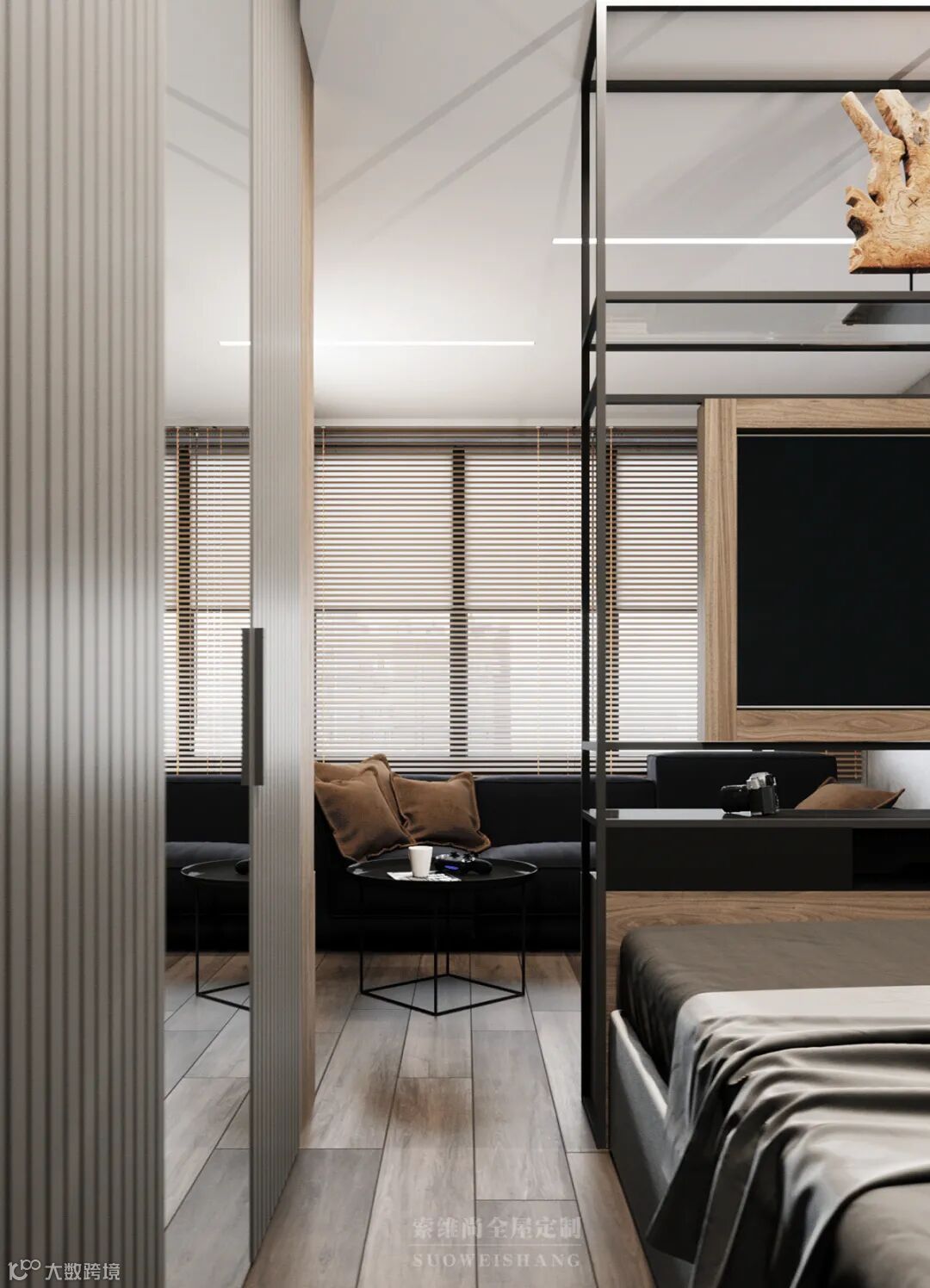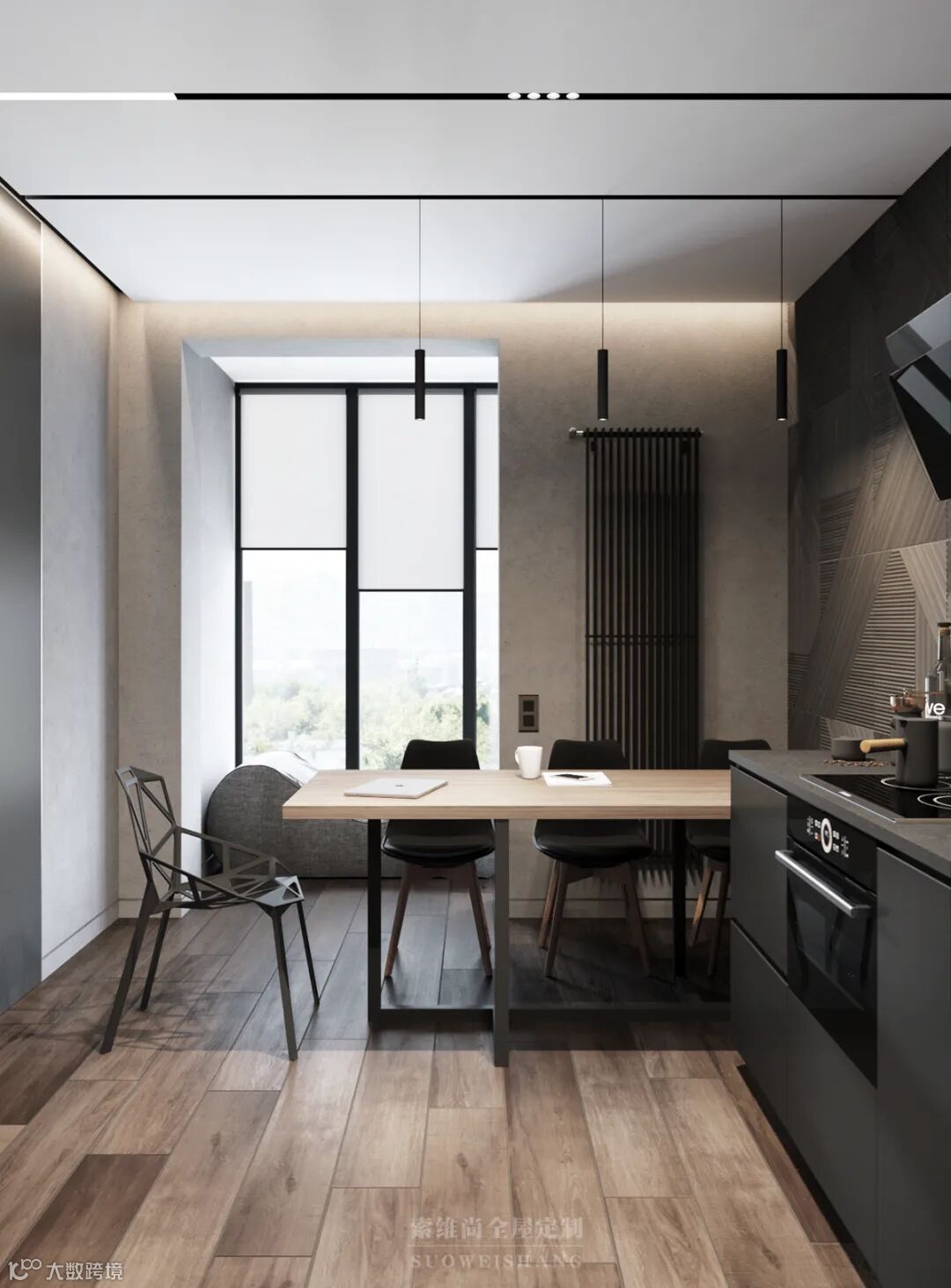 至简的线条设计,没有一处多余的修饰,你千万别以为这是没有追求,因为黑色、灰色的世界中,那一抹亮眼的木色,足以表达卓尔不群的个性。