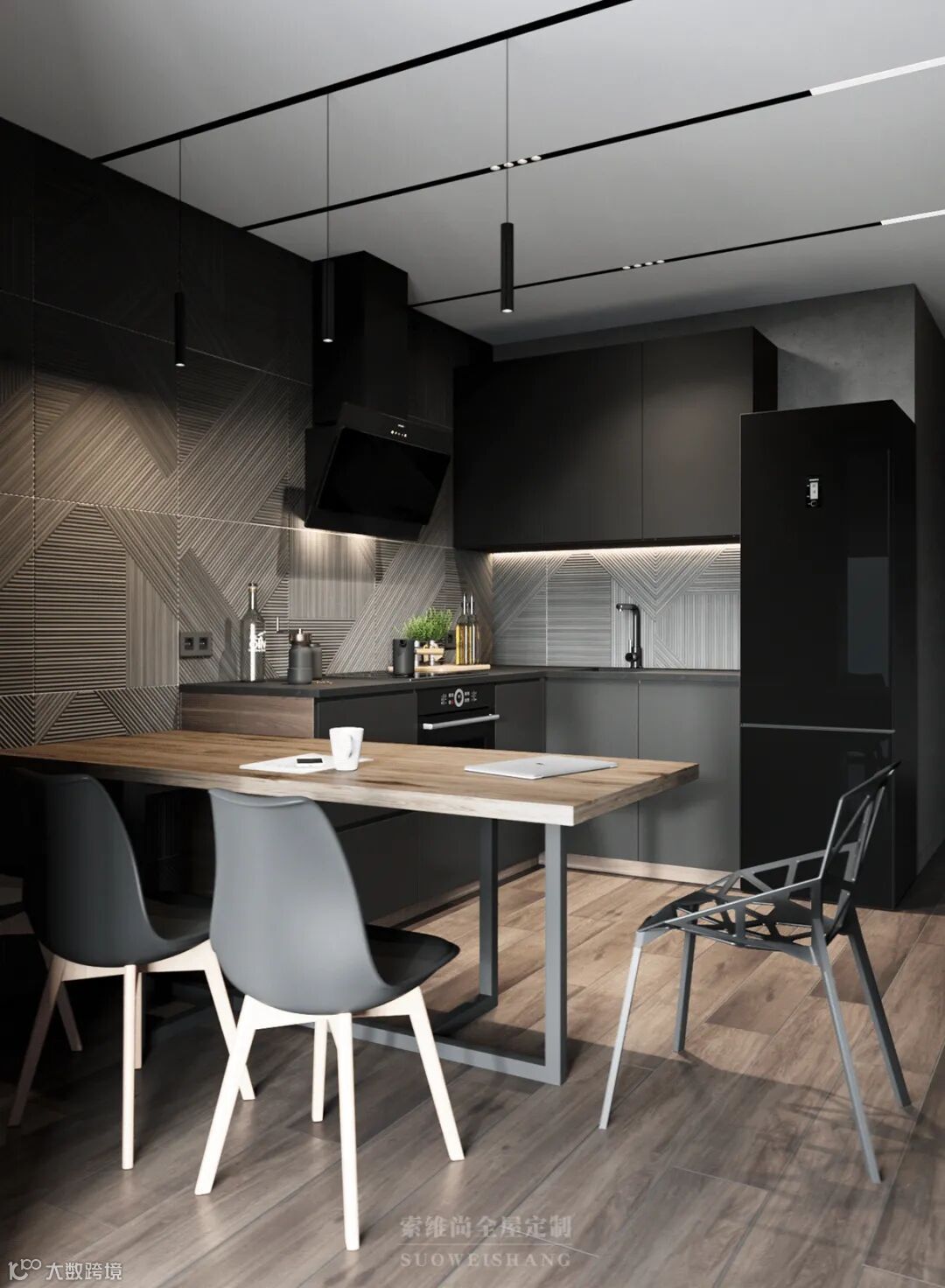 黑灰色打造出高级的空间,木色为空间带来自然的暖意,整个家以一种自由又不沉闷的方式呈现它独有的气质。