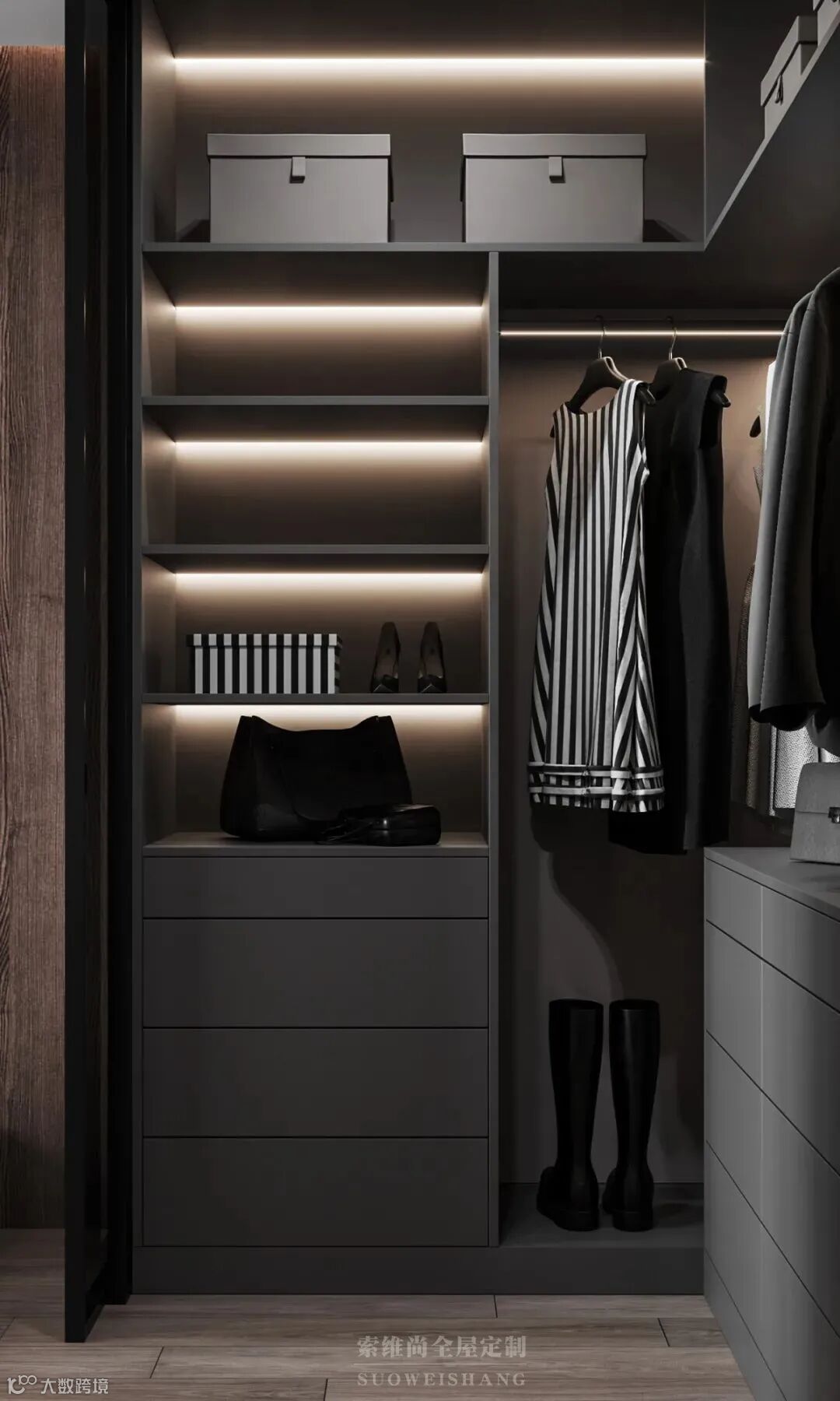 衣帽间的衣柜内装了藏灯,为找衣服提供了照明设计。