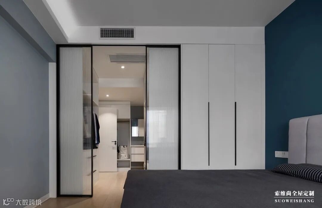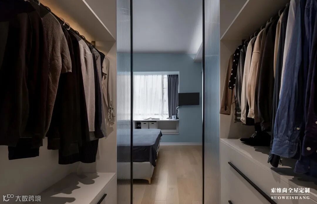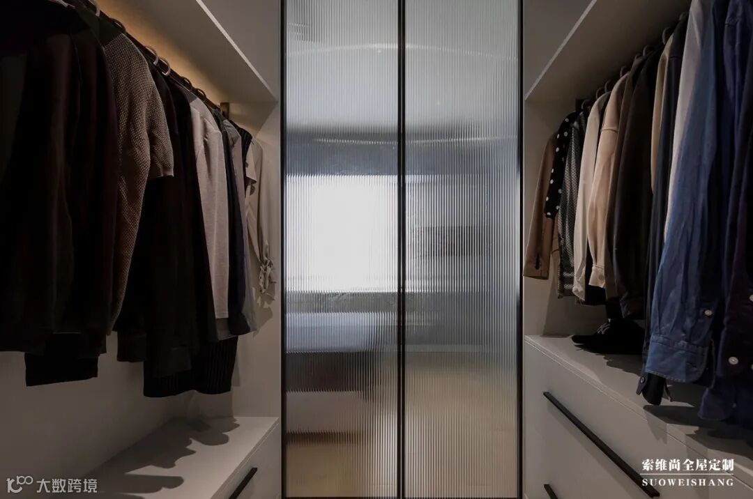 用玻璃隔断的方式来划分卧室空间与衣帽间,是如今一种比较流行的装修方式。