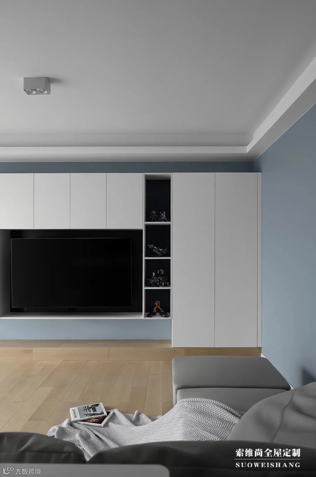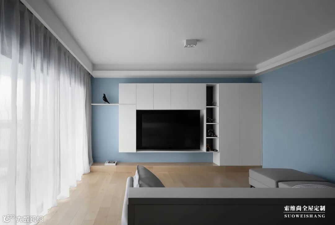 电视柜设计采用二八原则,80%有门板遮挡,20%开放式设计,可以摆放一些装饰品,这样显得美观,又不会有凌乱感,如果整个电视柜都是开放式的话,后期摆放东西会显得很乱的。