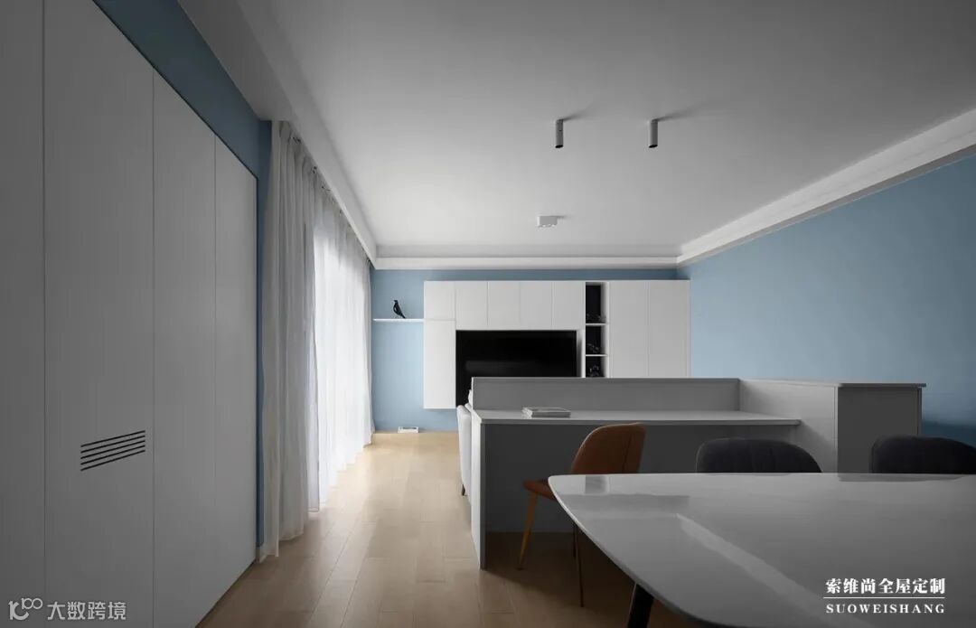 沉稳自然的深色床品,辅以降低了饱和度的蓝色系艺术漆,如微风吹过的海面。当阳光透过落地玻璃窗洒进室内,与空间自然融合成一幅“岁月静好”的画面。