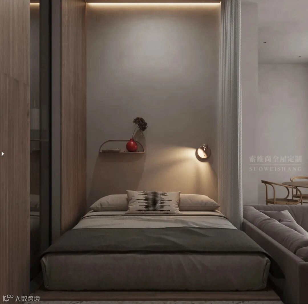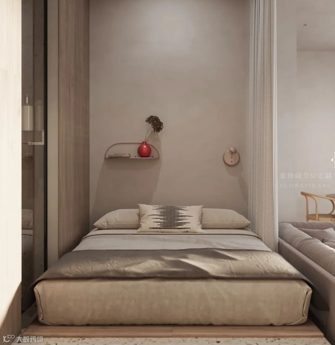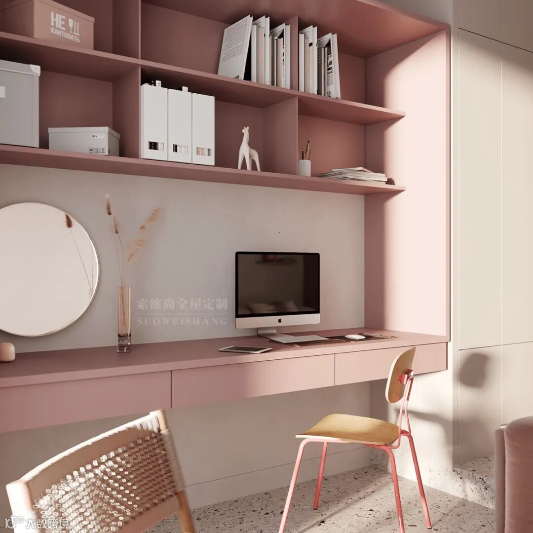 嵌墙式悬空的书柜与工作台一体化,工作台的另一侧作为梳妆台,空间的每一处面积都被考虑进设计,最大限度利用空间。