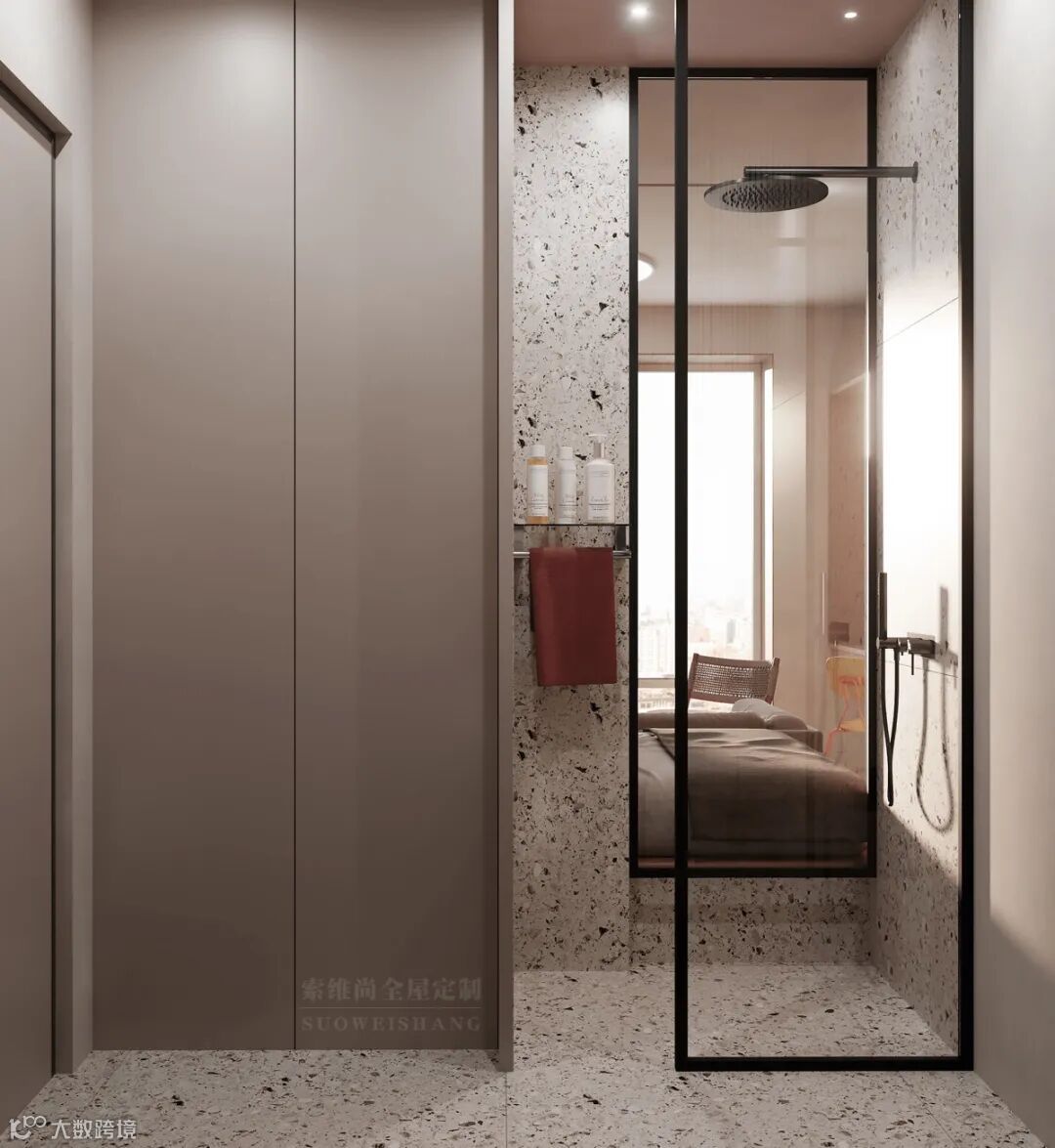 水磨石地面带着雅致俏皮的碎石图案,清冷细腻的材质平衡大面积的粉色压迫,打破颜色的乏味,给空间营造灵动轻盈的氛围。