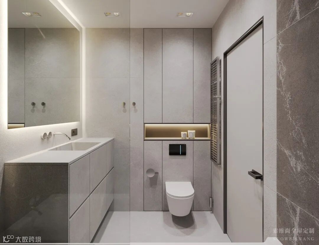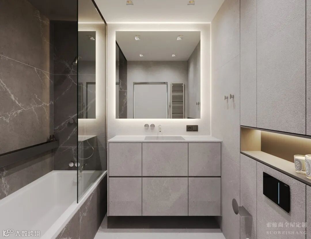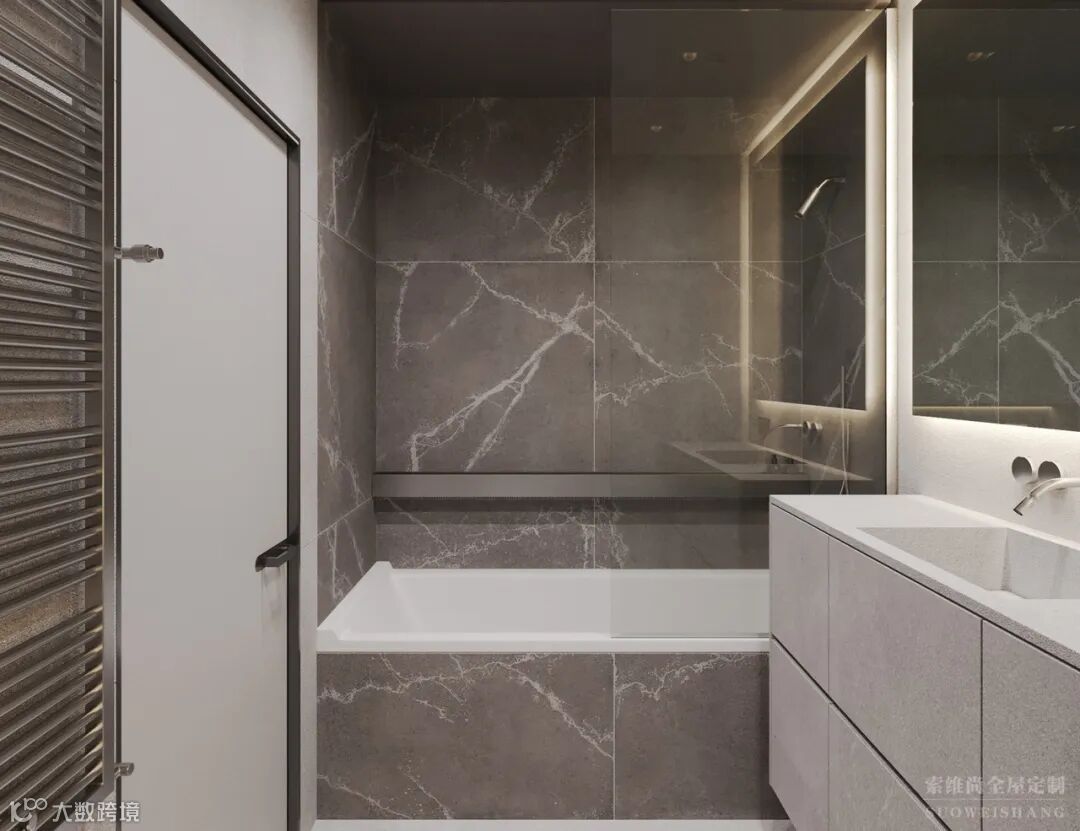 卫生间采用黑色大理石铺贴,大理石自然简洁的质感,使卫生间整个空间显得更加明亮,不仅彰显了一种美好、精致的生活态度,还透露出不俗的生活品味。