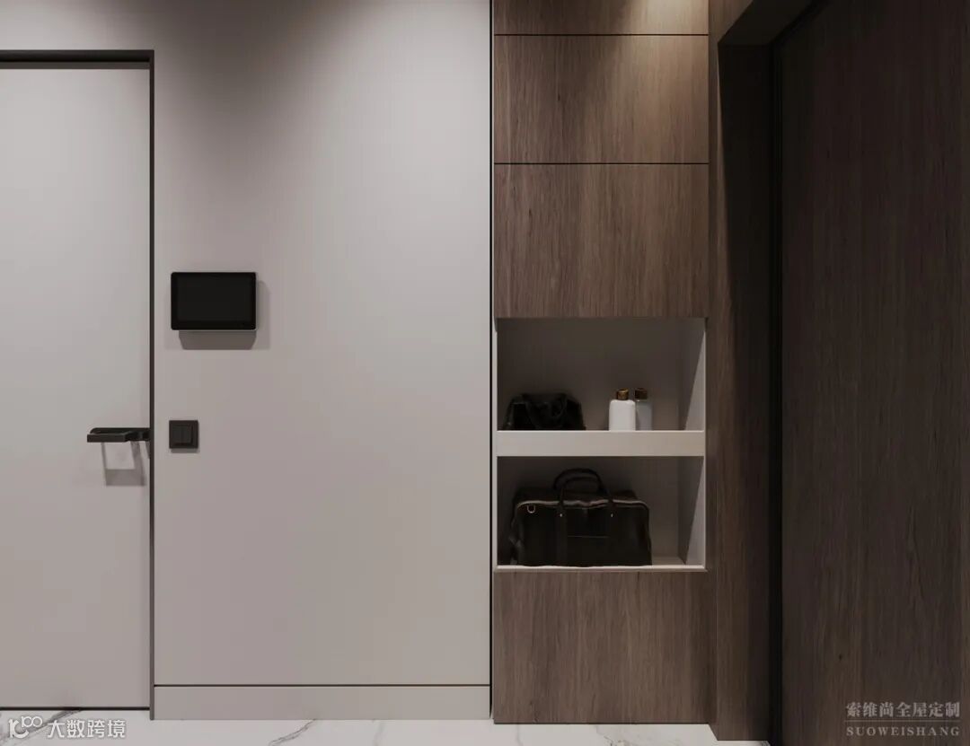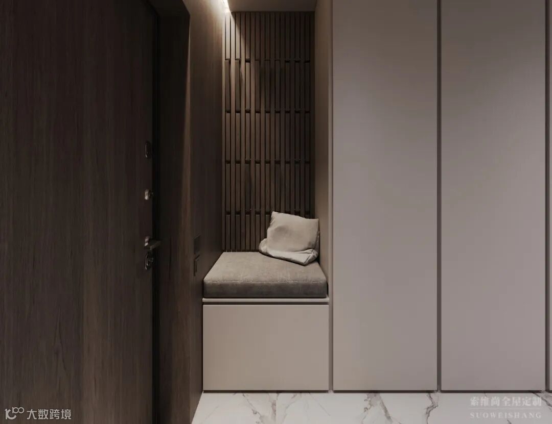 生活的美好在于设计的细节,入口左边是换鞋座椅,右边是储物柜,鞋柜做隐形收纳处理,拒绝玄关的脏乱差。