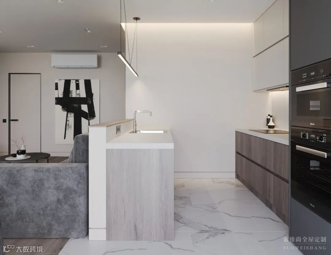 厨房的面积不大,采用内嵌式收纳电器设计,一方面节省空间,另一方面体现了现代感的设计。