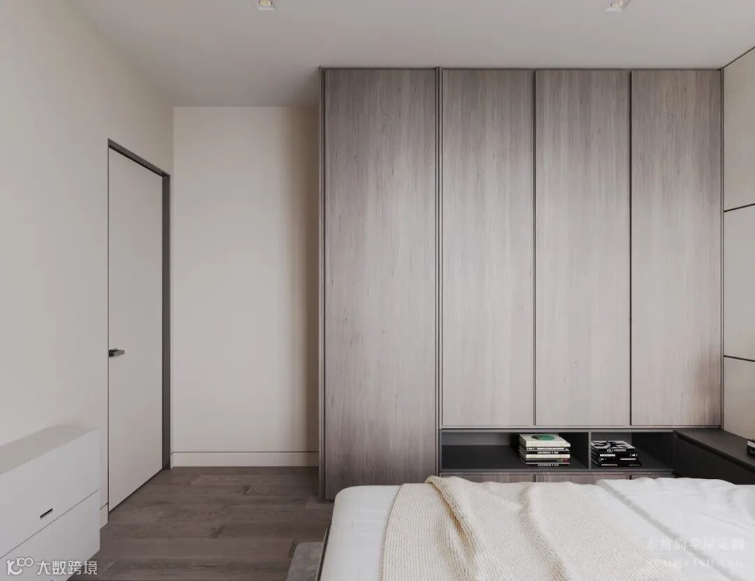 衣柜经过特别定制,与床头柜连成一体,底下还嵌入了搁物空间,方便放置一些书籍之类的东西。使用按压式平开门,视觉上非常简约。