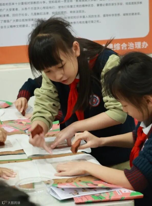 首先人手一块切割好的薯莨块、白色小方巾和拓印板,接着把拓印板按在小方巾上,再握紧薯莨块,来回用力擦抹,图案就能被拓印在小方巾上啦~