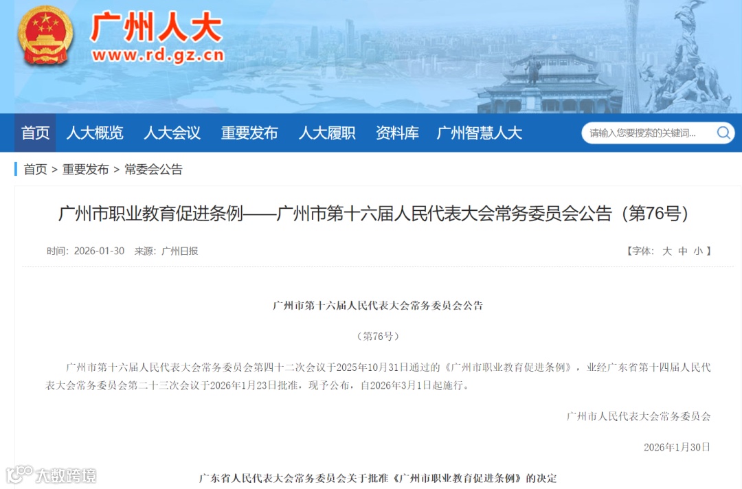 1月30日,广州市人大官网正式发布《广州市职业教育促进条例》(以下简称《条例》),《条例》自2026年3月1日起正式施行。