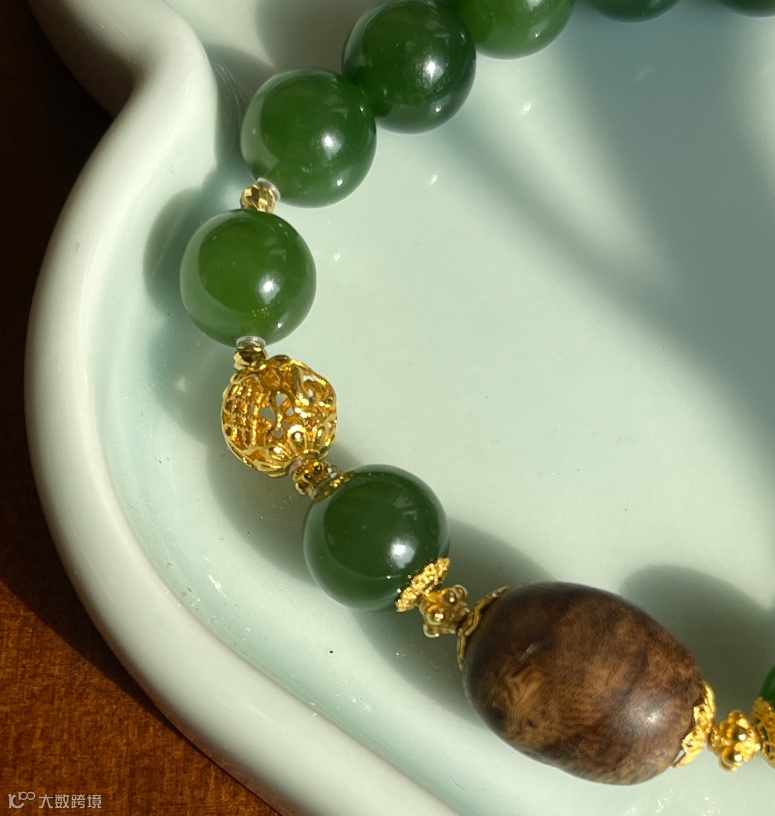 搭配的沉香桶珠纹理清晰,木质醇厚的香气萦绕腕间,与碧玉的冷润形成绝妙反差;18K金雕花配饰更是点睛之笔,镂空花丝工艺精致到细节,金饰的暖黄衬得碧玉的绿更显通透,轻奢又不张扬,日常戴或搭国风服饰都绝美。