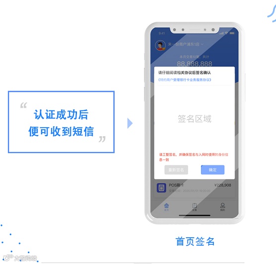 然后:收到认证成功短信,即开通。(例如:【海科融通】尊敬的用户,您好!欢迎使用海科融通产品。您的商户号为:A18982789919,用户名为商户号,密码为自行设定。)