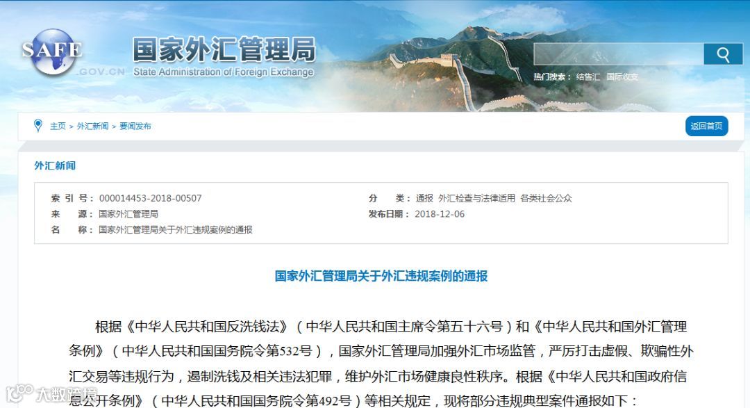 根据《中华人民共和国反洗钱法》(中华人民共和国主席令第五十六号)和《中华人民共和国外汇管理条例》(中华人民共和国国务院令第532号),国家外汇管理局加强外汇市场监管,严厉打击虚假、欺骗性外汇交易等违规行为,遏制洗钱及相关违法犯罪,维护外汇市场健康良性秩序。根据《中华人民共和国政府信息公开条例》(中华人民共和国国务院令第492号)等相关规定,现将部分违规典型案件通报如下: