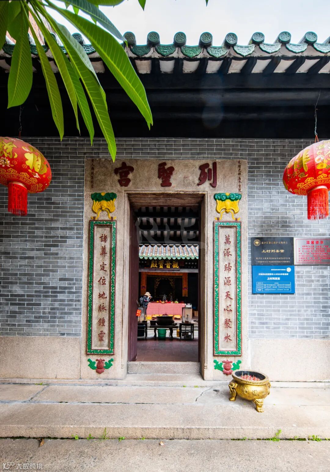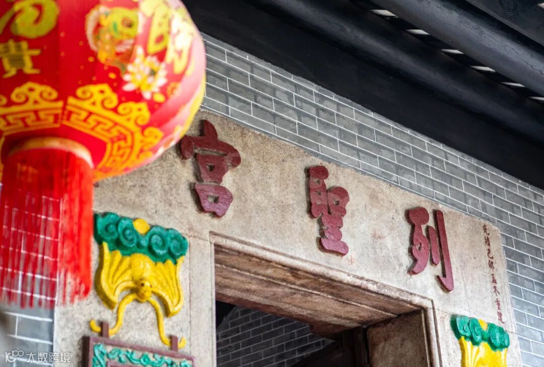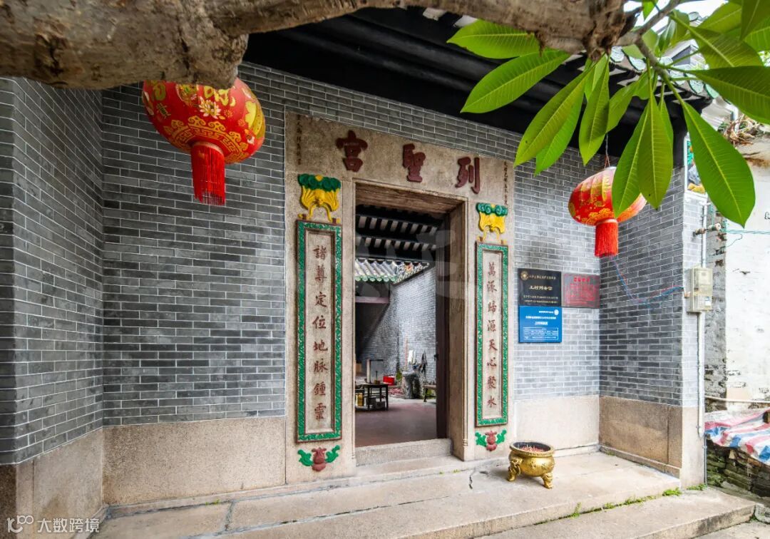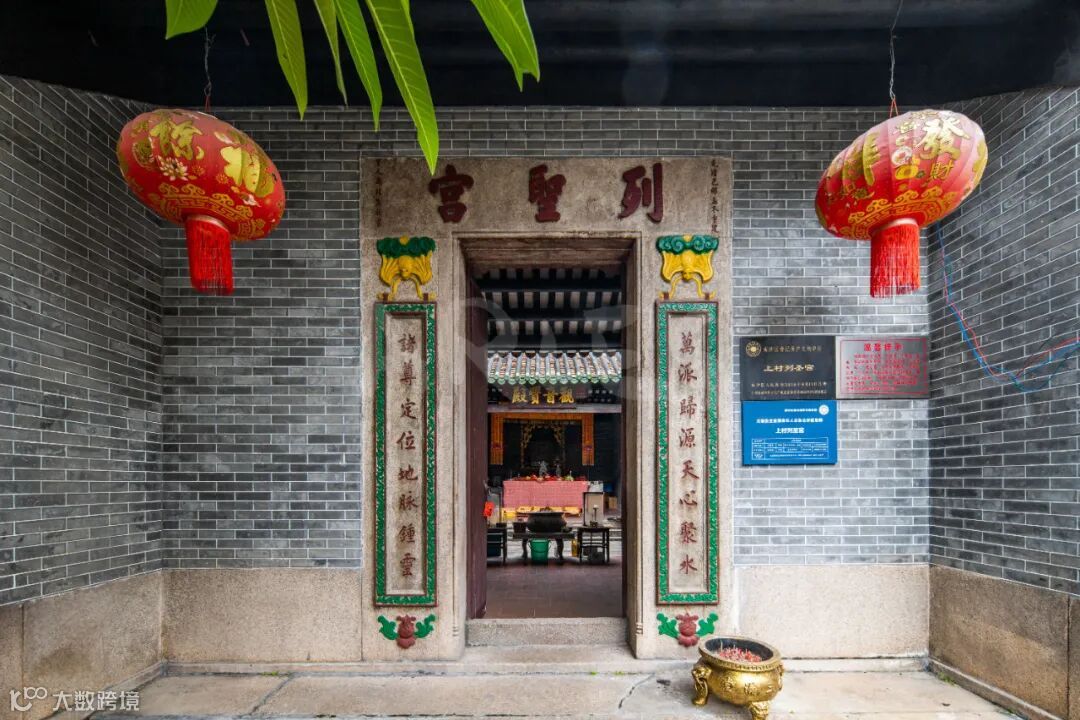 上村列圣宫位于广州市南沙区大岗镇岭东村,始建年代不详,曾于清乾隆二十七年(1762年)重建,并于清光绪六年(1880年)迁建至现址。该建筑坐北朝南,为三间两进格局,总面阔5.48米,总进深13.16米,占地面积约72.12平方米。采用硬山顶、镬耳封火山墙等传统建筑形式,以碌灰筒瓦覆盖屋面,绿琉璃瓦当与滴水剪边,青砖墙体,花岗岩墙基,体现出典型的岭南建筑风格。山门设有花岗岩石门夹,石门额上阳刻“列圣宫”三字,并落有清光绪六年款。