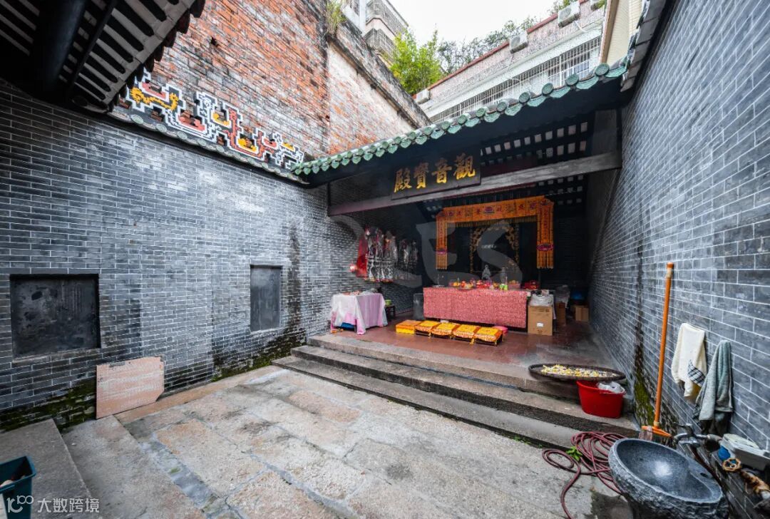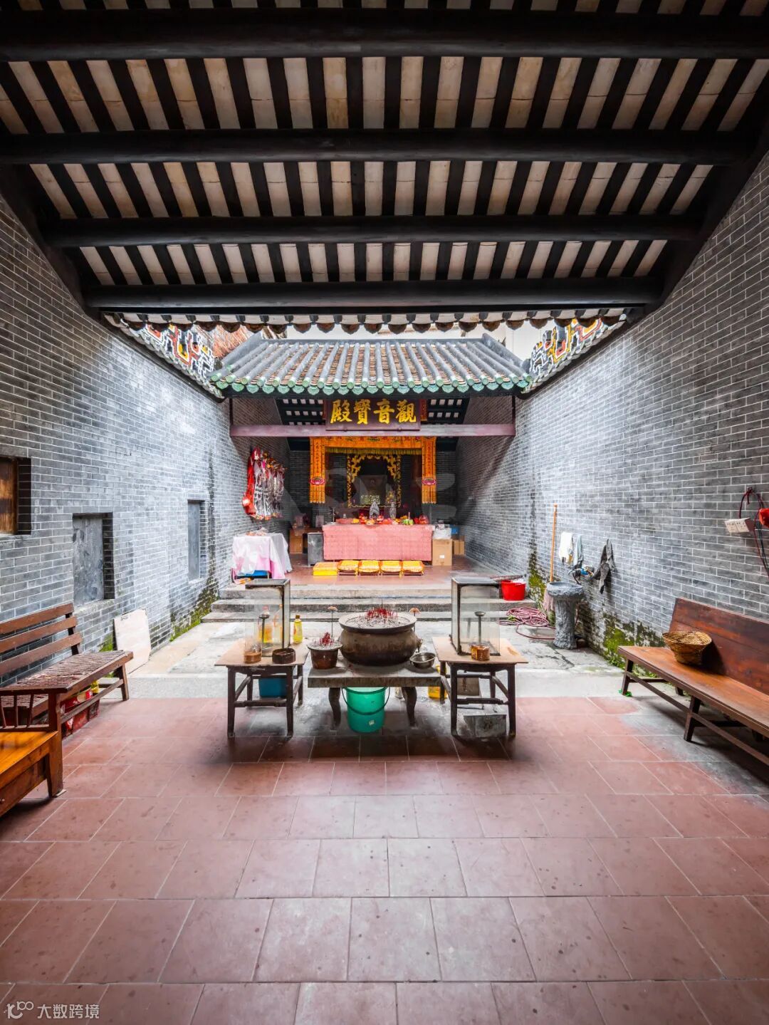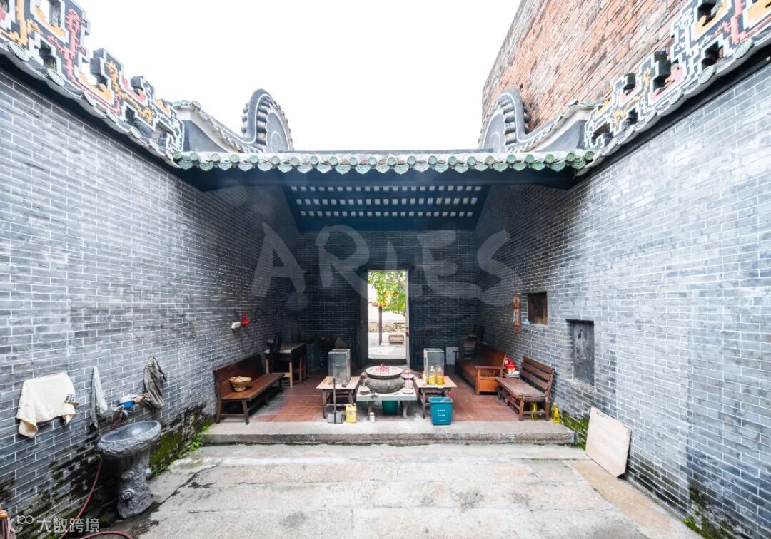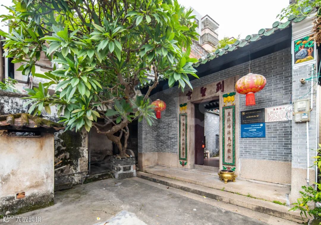 上村列圣宫位于广州市南沙区大岗镇岭东村,始建年代不详,曾于清乾隆二十七年(1762年)重建,并于清光绪六年(1880年)迁建至现址。该建筑坐北朝南,为三间两进格局,总面阔5.48米,总进深13.16米,占地面积约72.12平方米。采用硬山顶、镬耳封火山墙等传统建筑形式,以碌灰筒瓦覆盖屋面,绿琉璃瓦当与滴水剪边,青砖墙体,花岗岩墙基,体现出典型的岭南建筑风格。山门设有花岗岩石门夹,石门额上阳刻“列圣宫”三字,并落有清光绪六年款。