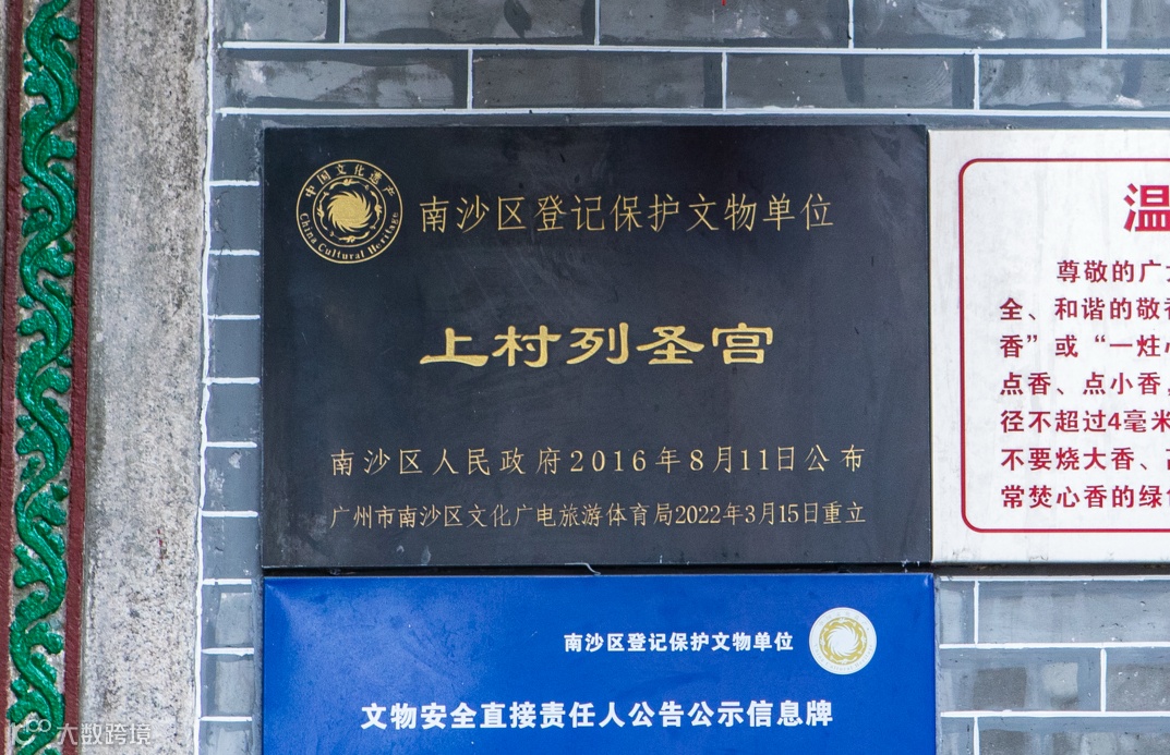 上村列圣宫在第三次全国文物普查中原属番禺区登记保护文物单位,2011年1月正式公布,2013年1月随行政区划调整划入南沙区,现为南沙区登记保护文物单位。据记载,该宫原供奉天后、观音、文昌帝、关武帝、包公、城隍等多位神祇,后不知何时起仅余观音一座,连所在的环村涌也因此改称“观音涌”。如今,每逢年节仍吸引众多善男信女前来上香朝拜,延续着地方的民间信仰传统。