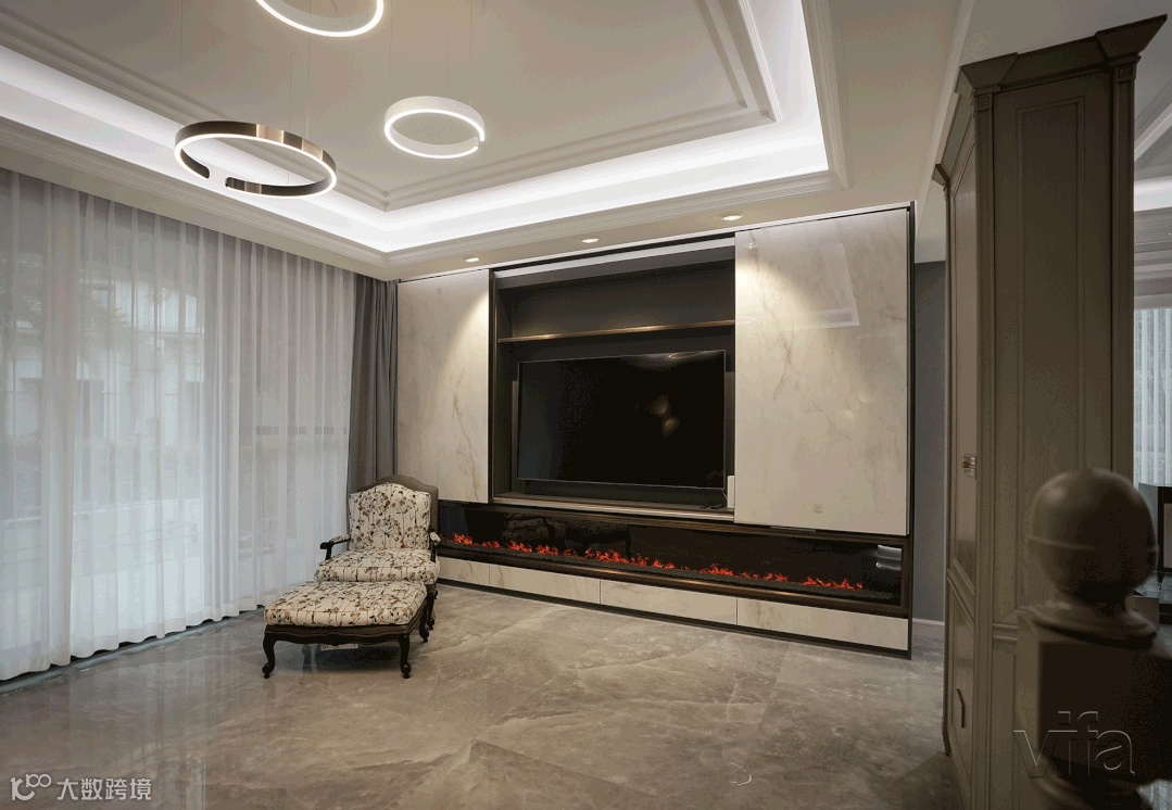 意大利卡拉金岩板打造的隐藏式电视柜,搭配3D电子壁炉,