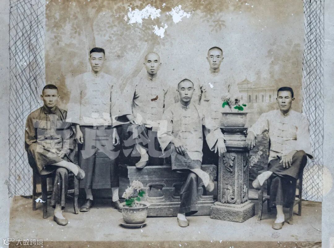 在对南沙香云纱发展脉络的梳理中,小铁和我所发现的一张老照片——“亭角六君子”合照,具有里程碑式的意义。该影像摄于1930年,记录了广州南沙亭角六位男士在照相馆中的郑重合影,是迄今发现的南沙地区最早的真实人物穿着香云纱的影像。其价值远不止于一张旧照,更是一份承载地方文化基因的重要视觉档案。