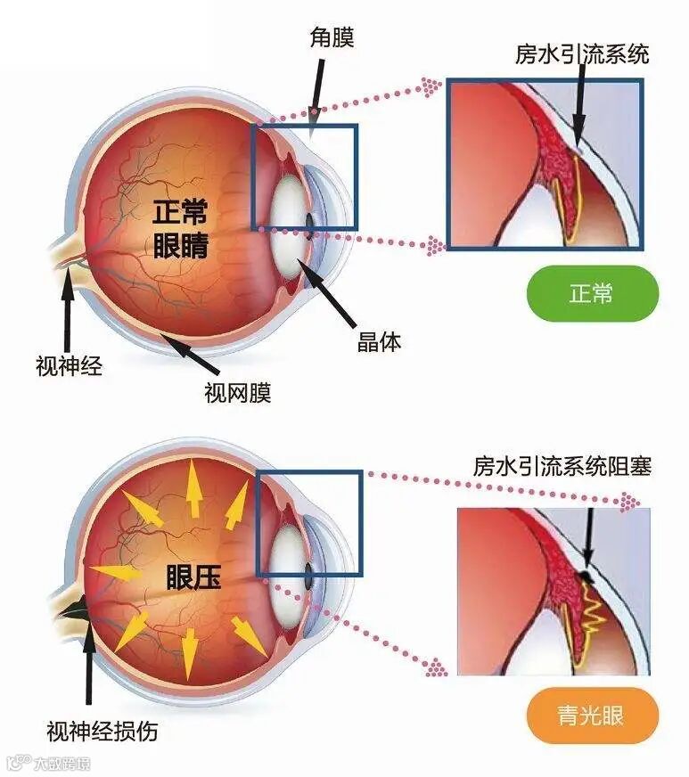 当眼球内有房水不断分泌出来,就需要疏导房水外流的“下水道”,这个“下水道”变得狭窄或堵塞,房水大量积聚又引流不出去,眼压就会急速升高,导致急性闭角型青光眼的发生。