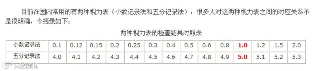 视力表是检查视力最常用到的工具之一,它能确定被检测者的视力状况。视力表上对视力有两种数据记录方式,五分记录法和小数记录法。可以换算: