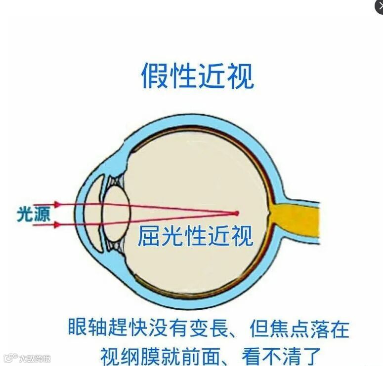 假性近视是相对真性近视而言。真正的近视眼是正视眼的屈光系统处于静止状态,即解除了调节作用后,眼的远点位于有限距离之内。换句话说,近视眼是由于先天或后天的因素而造成眼球前后径变长,平行光线进入眼内后在视网膜前形成焦点,引起视物模糊。而假性近视眼,是在看远处物体时还有部分调节作用参加。