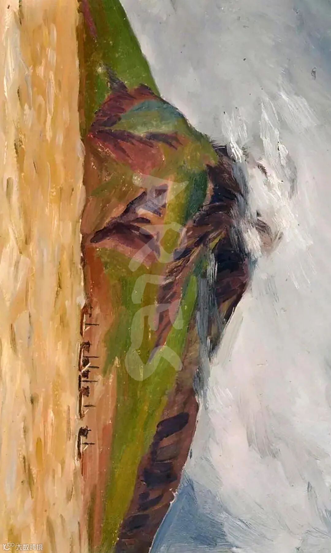 作为女性画家,王莉莎的视角带有独特的细腻与韧性。她没有刻意描绘壮丽山河或英雄史诗,而是捕捉了大虎山平凡却富有张力的瞬间:潮水退去后裸露的礁石,远处模糊的渔船轮廓,天空中徘徊的云团。这些意象共同构成了一种"等待"的状态——既是对历史伤痛的默默承受,也是对未来的谨慎期待。女性艺术家特有的生命感知,使这幅作品避免了当时常见的口号式表达,转而以含蓄的视觉语言诉说时代的集体无意识。