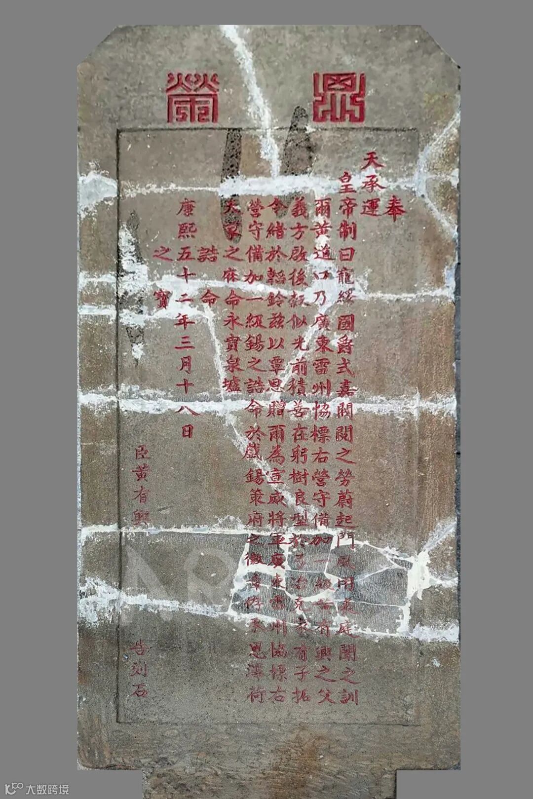 (2)清代守备一职是正五品,对应的武阶是武德骑尉,加一级对应的武阶应是昭武都尉。而碑文中的“宣威将军”与“守备、加一级”应该有的武阶有异,且“宣威将军”在清代已很少见到,这也给人很大的想象空间。总之,康熙五十二年是公元1713年,距今已300年,诰命碑中信息比较丰富,应该引起有关方面的注意。