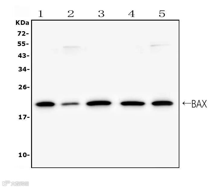 如上图,使用抗Bax兔多克隆抗体(A00183)进行的蛋白质印迹分析。在12%SDS-PAGE凝胶上,以80V(浓缩胶)/120V(分离胶)进行电泳2-3小时。在变性条件下,每个泳道的样品孔中装有50μg样品。