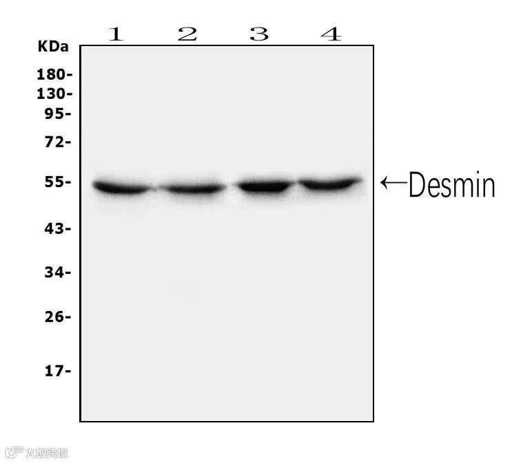 如上图,使用抗Desmin(BM0036)(MW:54KD)鼠单克隆抗体进行的蛋白质印迹分析。在10%SDS-PAGE凝胶上,以80V(浓缩胶)/120V(分离胶)进行电泳2-3小时。在变性条件下,每个泳道的样品孔中装有50μg样品。