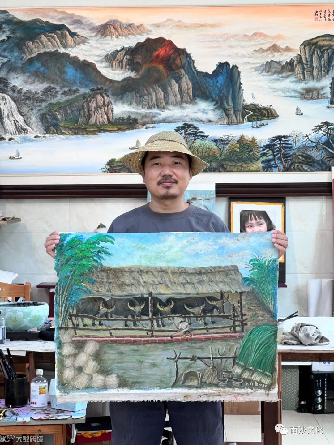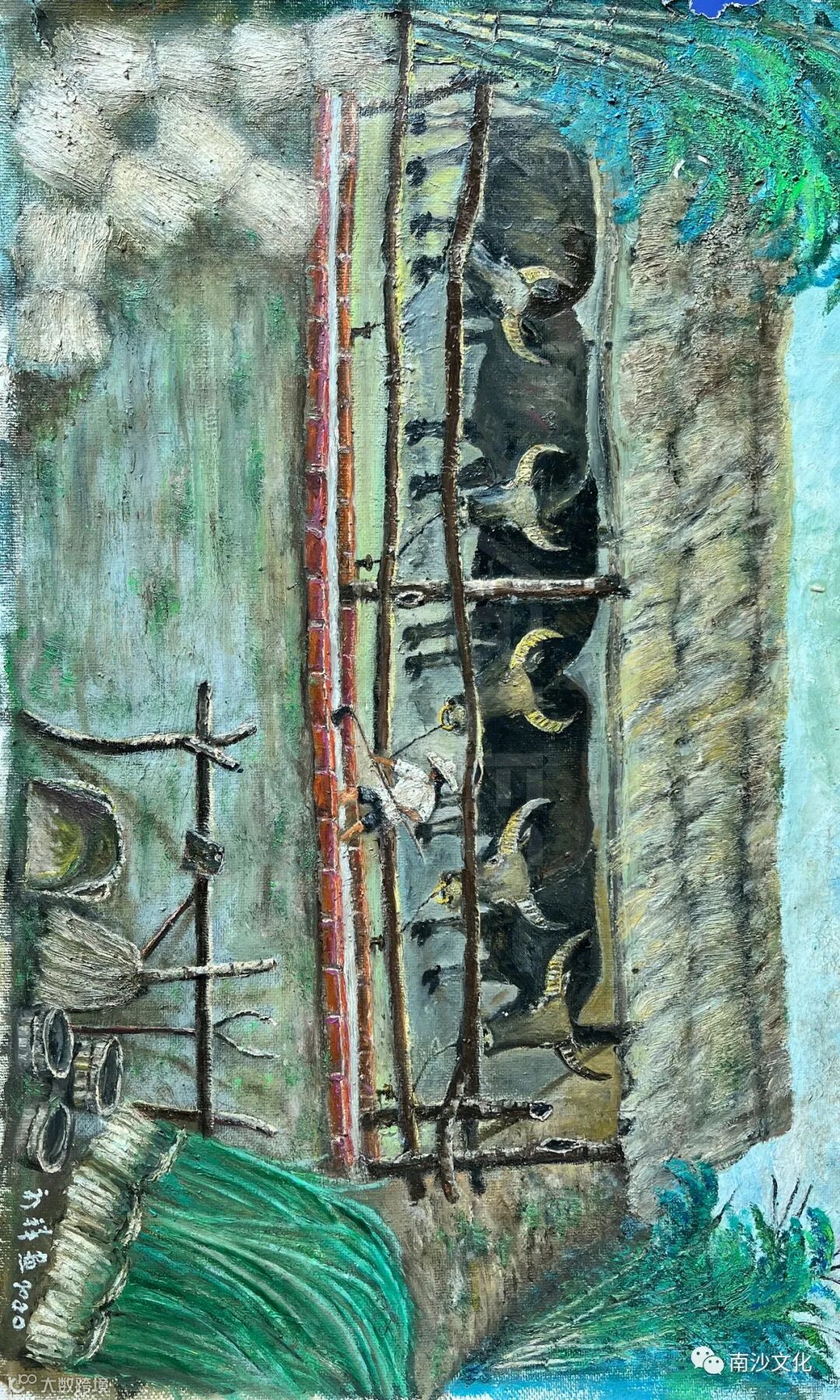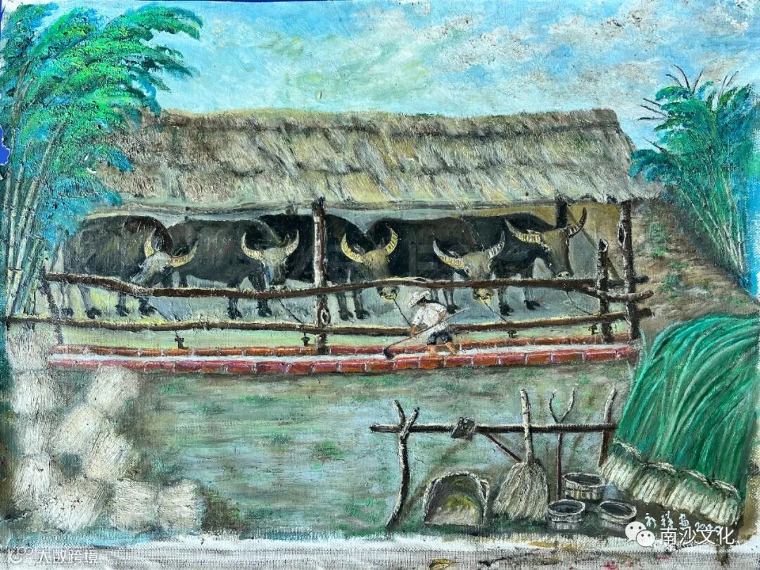 欣赏这位画家的作品,你便能感受到旧时南沙水乡生活的气息扑面而来。他以贴近生活和时代变迁的乡村风貌为创作题材,绘就出一幅幅充斥着满满人情味与乡之愁的画作。而在画风上,陈永祥的画更带有满满的童心童趣特色,让人一眼就能记住。朴拙的房屋和小船,可爱的家禽,卡通形象般的人物,像是在用孩童的眼睛看世界。