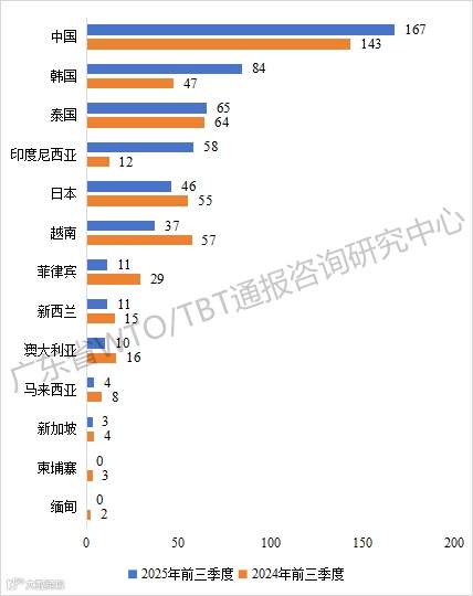 《区域全面经济伙伴关系协定》(RCEP)*³成员国2025年前三季度共提交了496件TBT通报,同比增加9%。其中,TBT通报数同比增长最明显的是印尼和韩国。越南、菲律宾、澳大利亚和新西兰等所提交的TBT通报数则有不同程度的减少(见图2)。