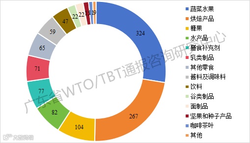 在食品方面,通报最多的类别是“水果和蔬菜”(38例),该类食品的通报数占中国产食品通报数的22.5%(见表6、图7),违规原因主要是农药残留和重金属问题。农药残留一直是中国输欧食品被RASFF通报的主要原因,前三季度RASFF公布的中国产食品通报中,约有24.3%涉及的违规原因是农药残留超标或检出未授权的农药,常见的违规农药包括毒死蜱、啶虫脒和蒽醌等。除杀虫剂外,出口企业还需要关注植物生长调节剂的问题,前三季度有两例食品因矮壮素超标而被RASFF通报。