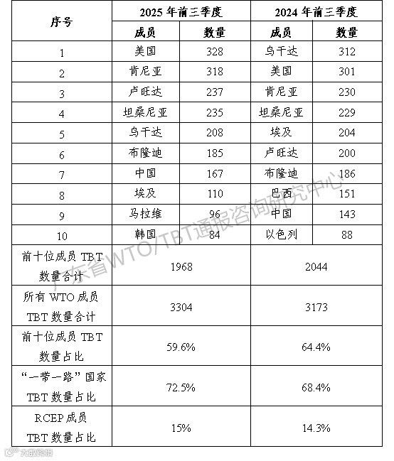 2025年前三季度(1月1日至9月30日,下同),世界贸易组织(WTO)的166个成员中共有84个成员提交了3304件TBT通报*¹,同比增长4.1%,其中包括2047件新通报、1144件补遗通报、76件修订通报和37件勘误通报。提交通报数量位列前十位的成员依次是:美国、肯尼亚、卢旺达、坦桑尼亚、乌干达、布隆迪、中国、埃及、马拉维和韩国,以发展中经济体为主。