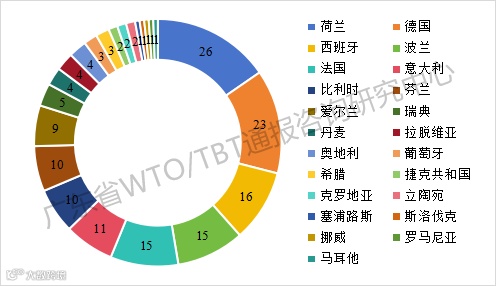 2025年前三季度通报中国产食品最多的国家是荷兰,其次是德国和西班牙(见表7、图8)。荷兰和德国的食品安全监管较为严格,多项食品标准严于欧盟标准,企业应加以注意。