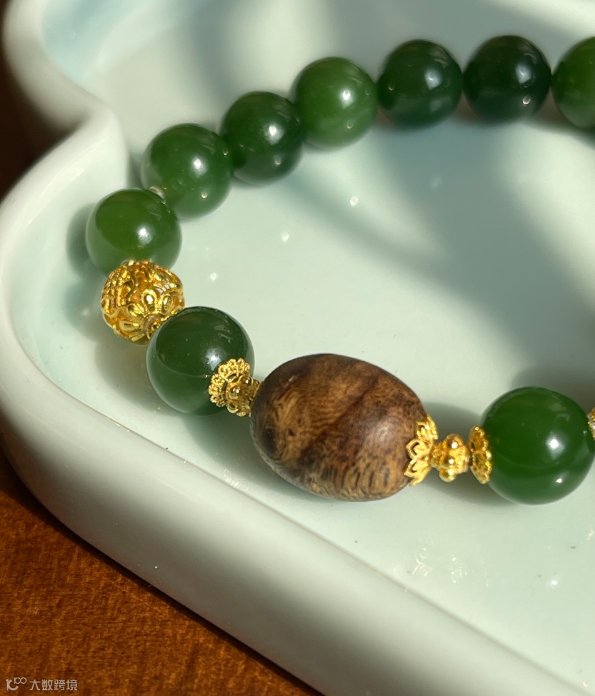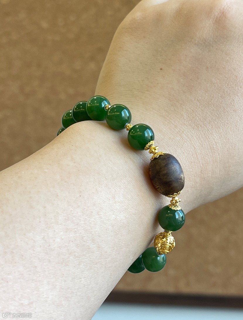 搭配的沉香桶珠纹理清晰,木质醇厚的香气萦绕腕间,与碧玉的冷润形成绝妙反差;18K金雕花配饰更是点睛之笔,镂空花丝工艺精致到细节,金饰的暖黄衬得碧玉的绿更显通透,轻奢又不张扬,日常戴或搭国风服饰都绝美。
