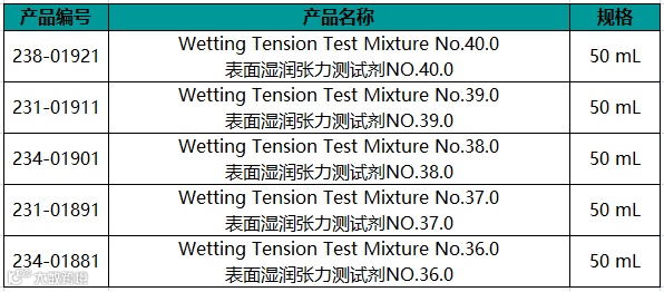 可提供共36种从22.6号到70号的表面张力测试剂。