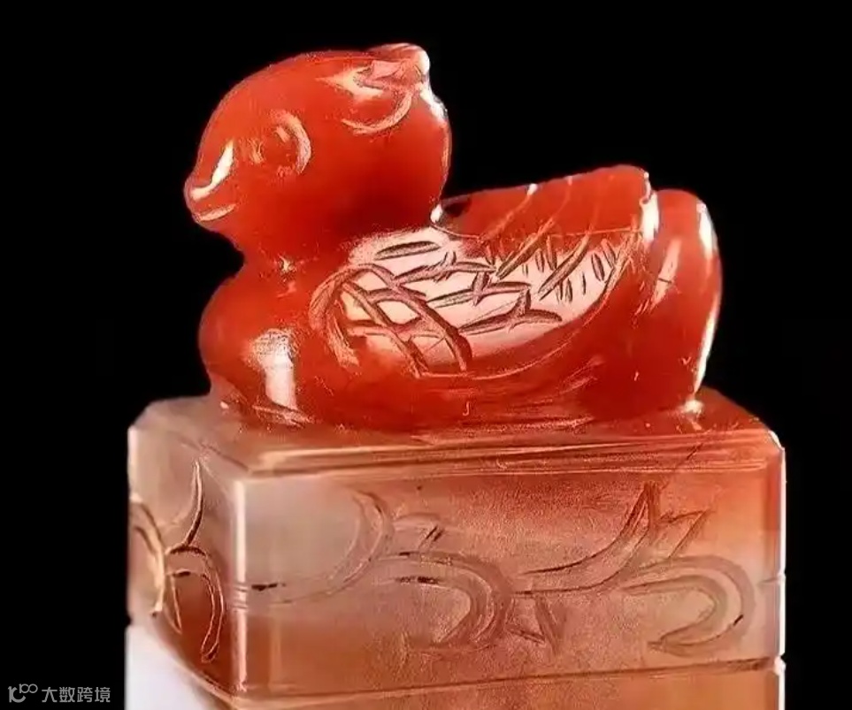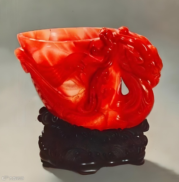 宫廷匠人更将南红雕琢成传世重器。现藏于故宫博物院、被誉为国家一级文物的南红玛瑙凤首杯,以其绝佳的材质与吉祥的寓意,深受历代皇帝喜爱。另一件杰作“红白玛瑙巧做双鱼龙花插”,则巧妙利用玛瑙天然的红白双色,雕出灵动鱼龙,底部刻“乾隆年制”款,堪称清代玉雕工艺的巅峰之作。