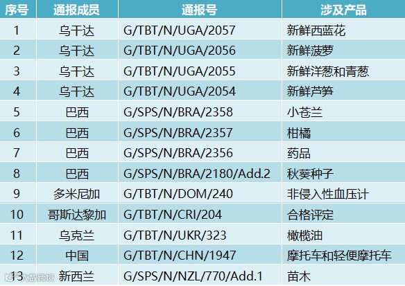 2024年12月3日,共有7个WTO成员通报了13项技术性贸易措施,其中8项为TBT措施,5项为SPS措施。通报情况为:乌干达4项、巴西4项、多米尼加1项、哥斯达黎加1项、乌克兰1项、中国1项、新西兰1项。这些措施涉及新鲜芦笋,小苍兰,药品,秋葵种子,非侵入性血压计,橄榄油,摩托车和轻便摩托车,苗木等。通报详情如表所示。