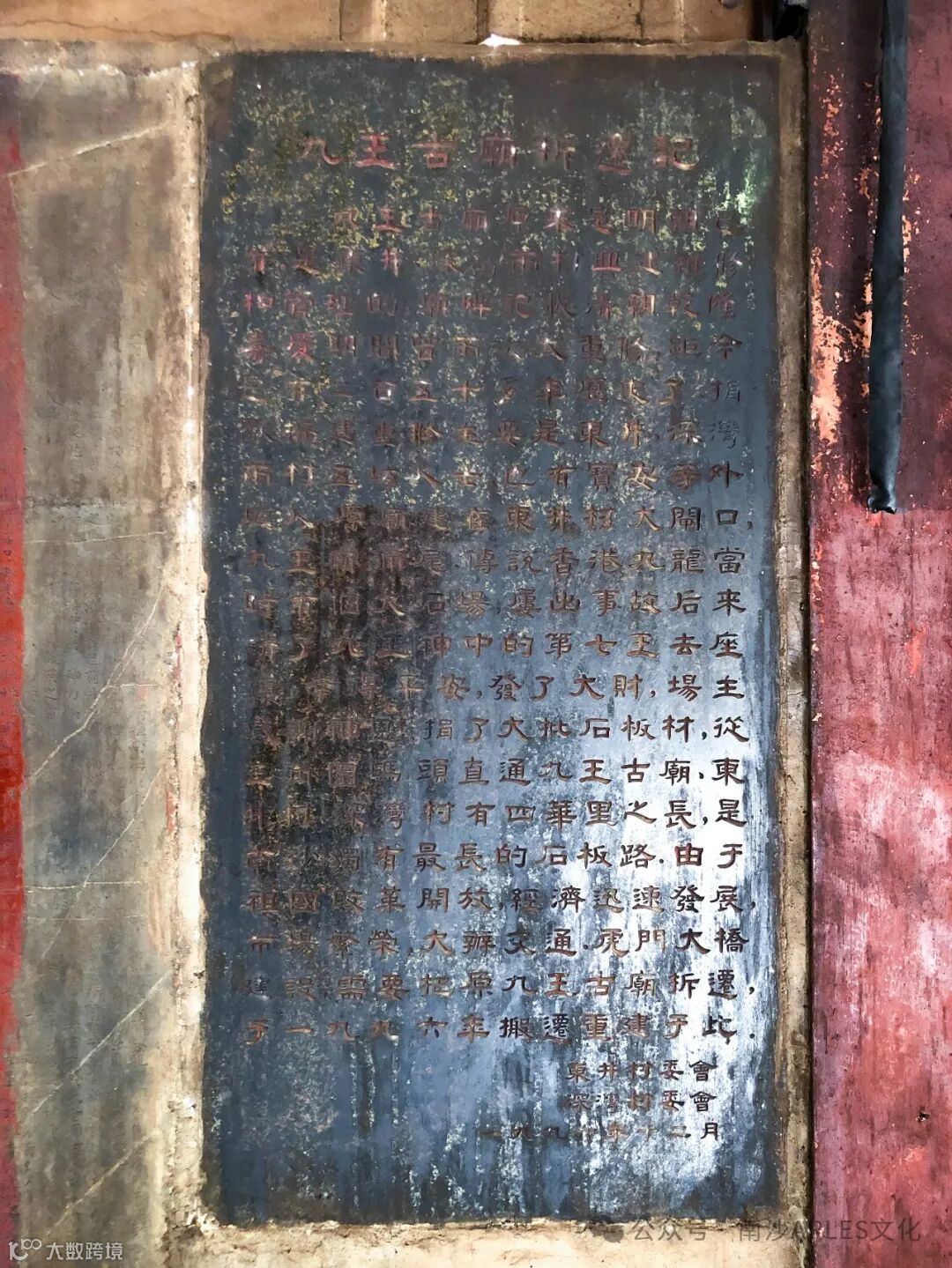 献词记事碑是清朝拔元朱清兰书写的。在“献辞记事碑”中还记载了他亲身经历的一次惊险的遭遇:嘉庆二年五月的一个夜晚,他在海上遭遇大风,他和六七只营船停靠宁洲湾,认为没什么大碍。不料二更时分,乌云遮天,迅雷烈风大作,船只被大风刮着不知飘向何处。船夫大喊救命,他在心中默念九王祈求护救。不ー会儿,看到一道神光从天而降罩住船身。天明时,他看到自己还活着,而营船只剩下了一两艘,更加深信是九王暗中保护着他。