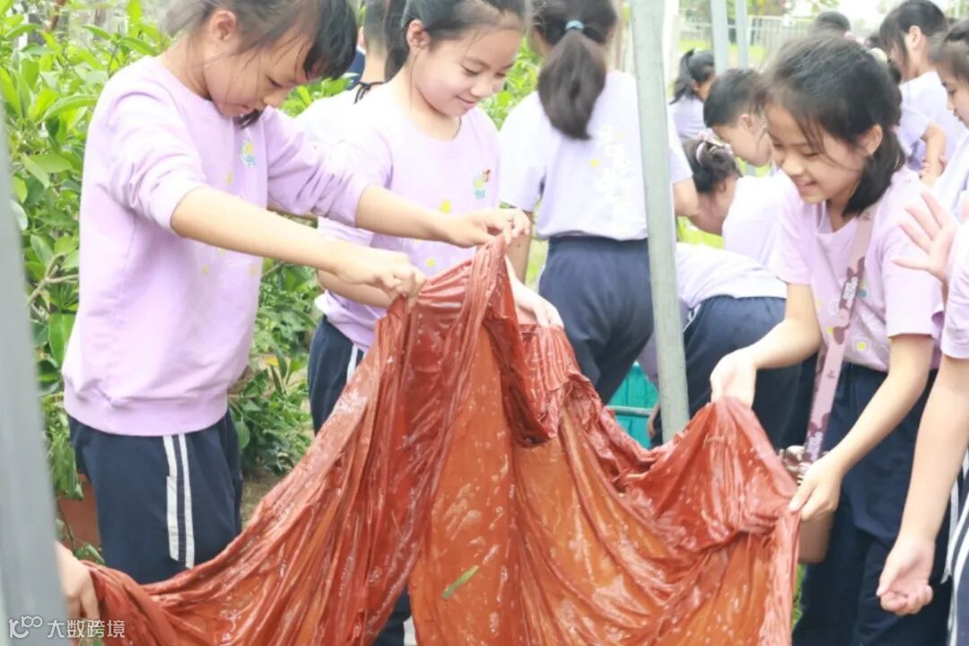 晒莨场上,孩子们学着香云纱老师指导的样子,把浸过薯莨汁的布匹捞出来合作拧干——