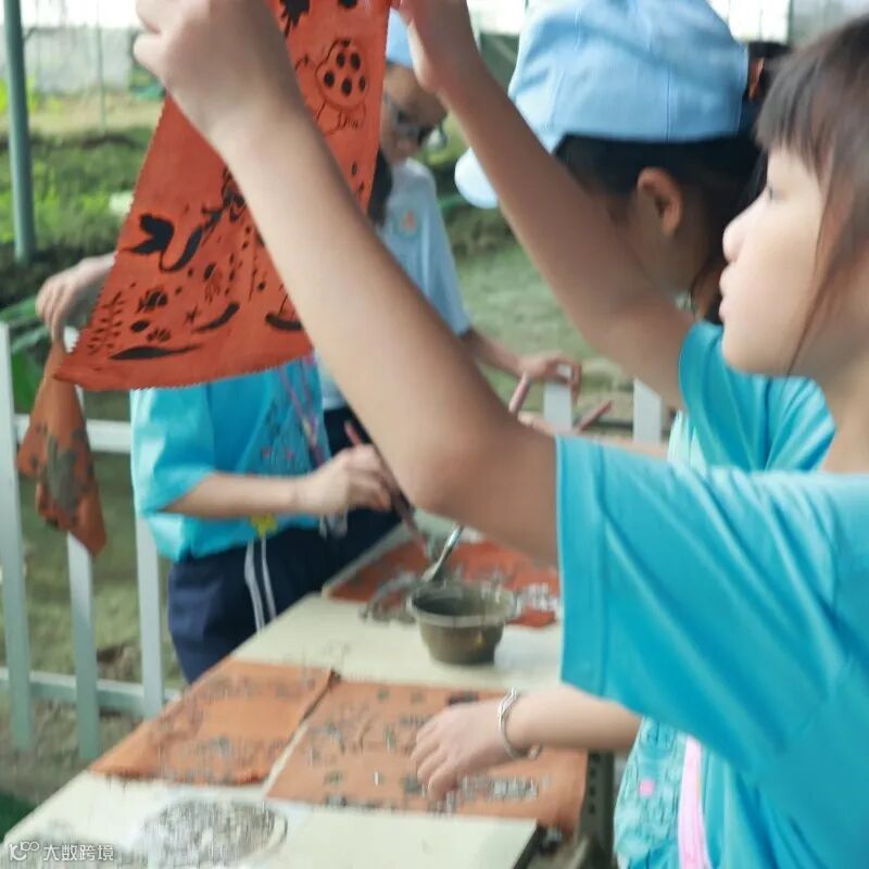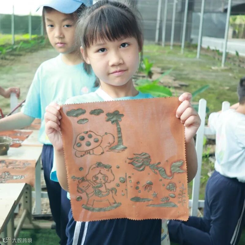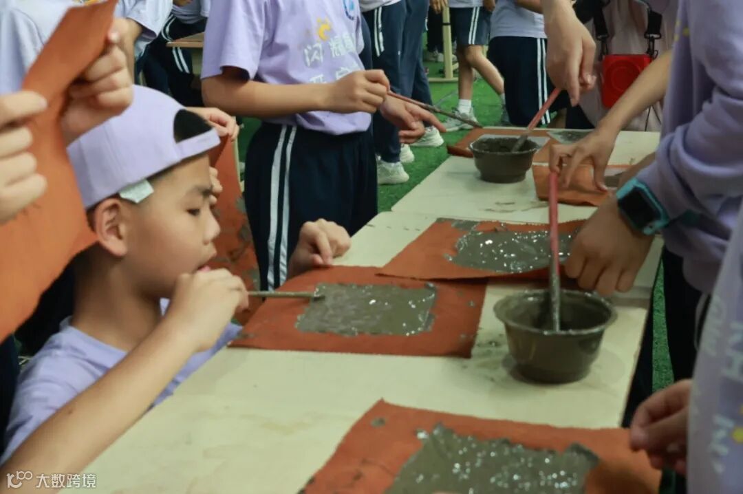 孩子们握着画笔把河泥均匀涂抹在拓印板上。泥浆覆盖,正悄悄和布发生着化学反应。