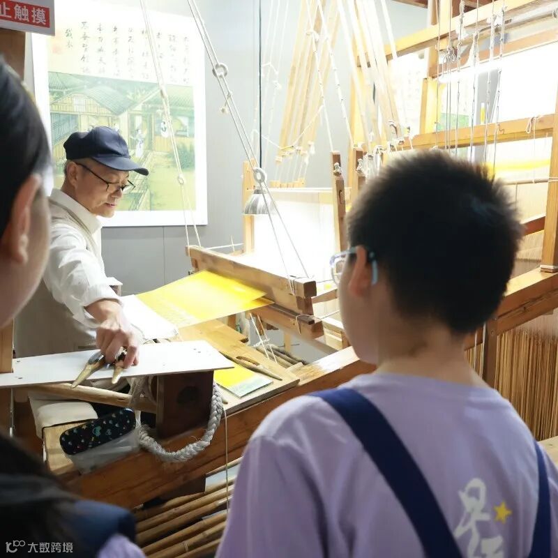 继续前行,四号展厅里还陈列着制作工具和各式织机。孩子们一边听讲解,一边认真观察,眼神里满是对这项传统技艺的好奇与敬意~