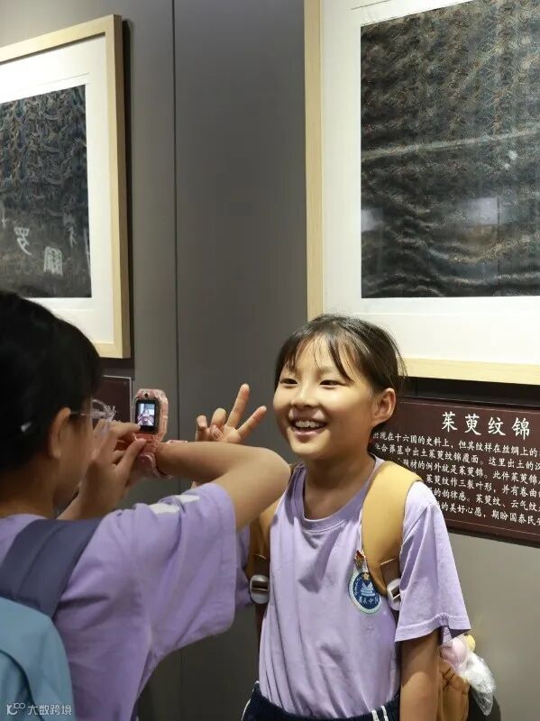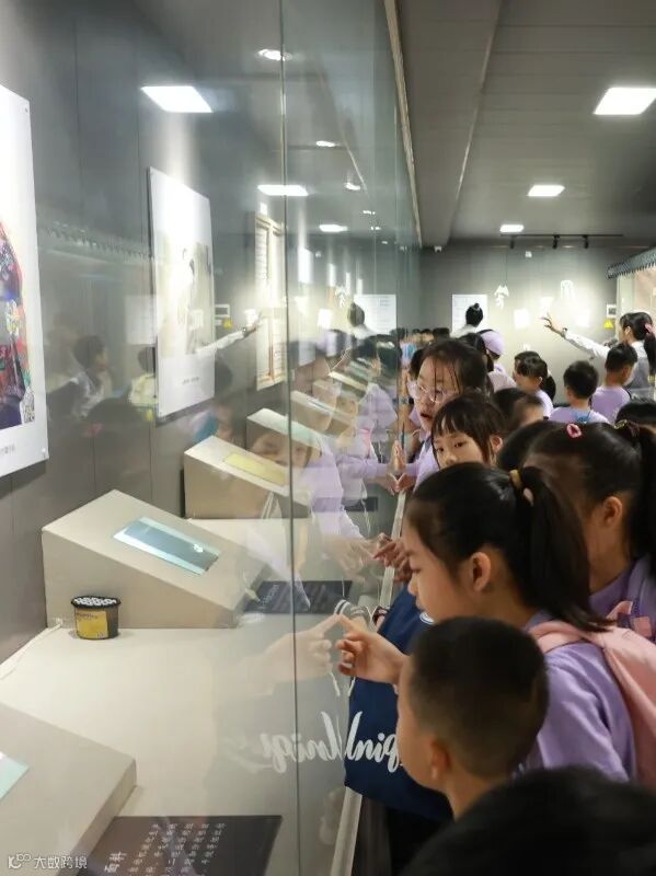 孩子们一边听香云纱老师的讲解,一边端详玻璃展柜中的展品,还有的兴致勃勃地合影留念呢~