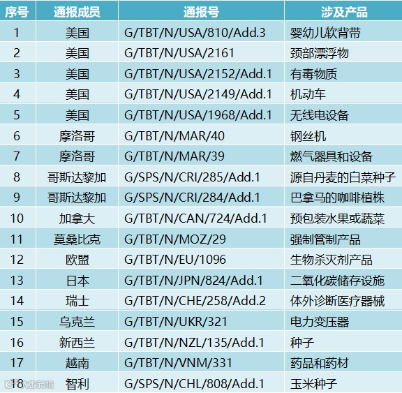 2024年11月21日,共有12个WTO成员通报了18项技术性贸易措施,其中15项为TBT措施,3项为SPS措施。通报情况为:美国5项、摩洛哥2项、哥斯达黎加2项、加拿大1项、莫桑比克1项、欧盟1项、日本1项、瑞士1项、乌克兰1项、新西兰1项、越南1项、智利1项。这些措施涉及婴幼儿软背带,颈部漂浮物,有毒物质,钢丝机,燃气器具和设备,强制管制产品,体外诊断医疗器械,电力变压器,种子,药品和药材等。通报详情如图表所示。