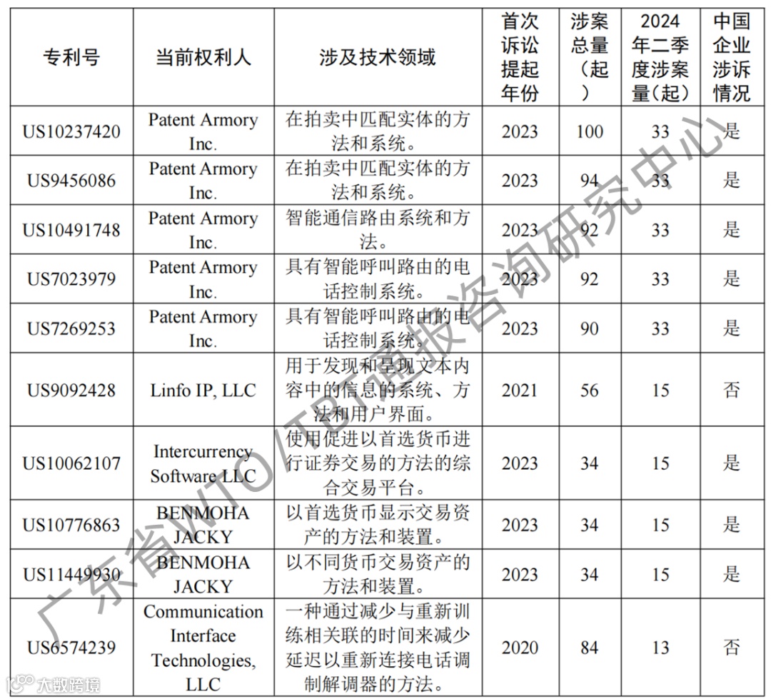 1. 高频涉案专利的涉案总量统计截至2024年二季度。