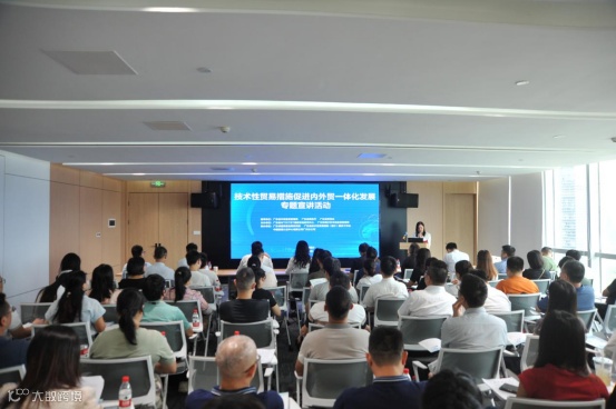 9月27日,作为“质量月”活动内容之一,由广东省市场监督管理局、广东省商务厅、广东省贸促会指导,广东省WTO/TBT通报咨询研究中心、广州市南沙区市场监督管理局联合主办的技术性贸易措施促进内外贸一体化发展专题宣讲活动在广州南沙举办,吸引近100名企业代表参加活动。本次活动邀请了广东省WTO/TBT通报咨询研究中心、中国质量认证中心有限公司广州分公司、广东卓越质量品牌研究院等内外贸服务机构专家,围绕技术性贸易措施服务、品牌建设、“同线同标同质”认定、贸易调整援助政策解读等内容与参会企业进行分享和面对面交流。