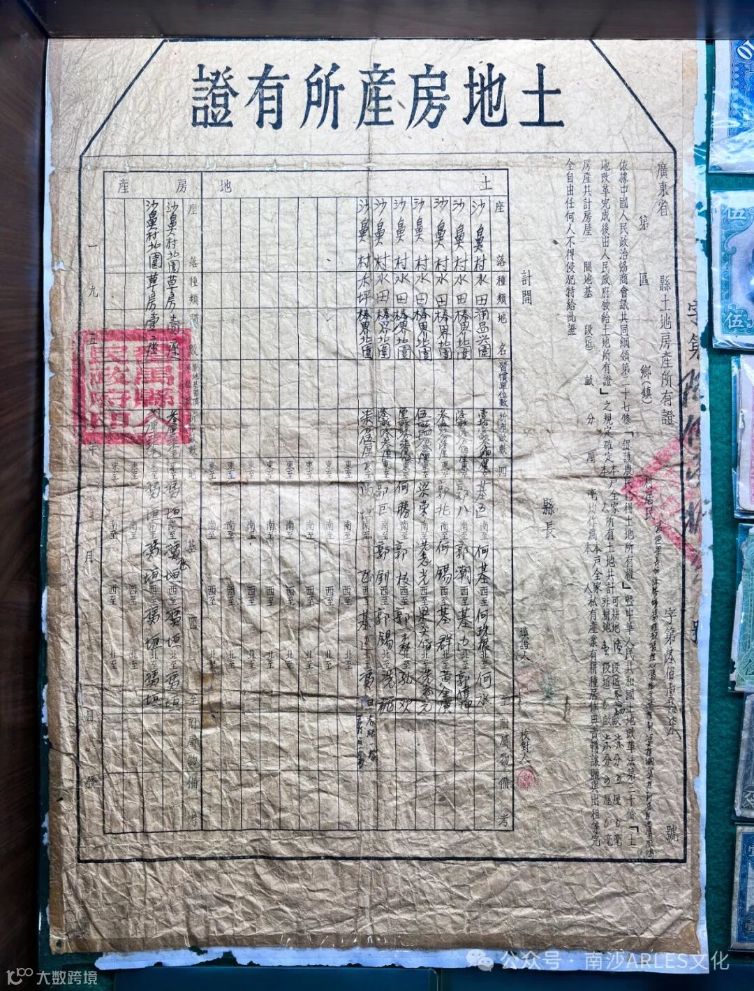 这可不是普通的旧纸,而是1950年南沙东涌镇沙鼻村的土地房产所有证,距今已有70多年历史。纸张边缘微微卷起,油墨字迹虽有些斑驳,却依然清晰可辨——上面的户主姓名、土地面积、四至边界,甚至还有那枚鲜红的“番禺县人民政府印”纹路,都完好地保存着。