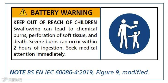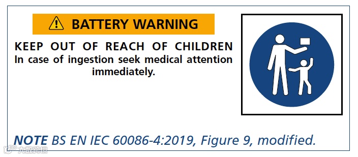 1)在含有硬币电池或锂电池的消费品上作标记:包含硬币电池或锂电池的消费品包装应包含图 1所示的文字、警语和对比色;