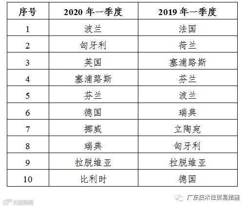 表3 2020年一季度欧盟安全门通报中国消费品的前10个国家