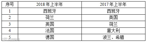 表9 2018年上半年与去年同期欧盟RASFF召回食品前5位通报国家对比
